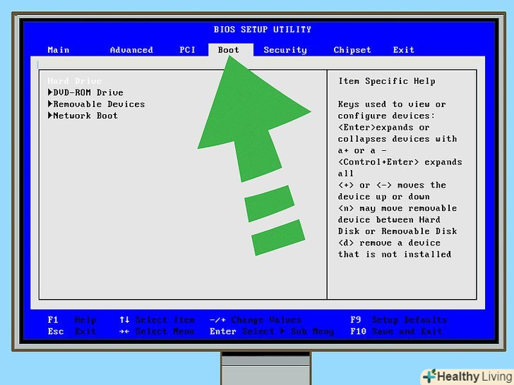 Знайдіть розділ " Boot Order "(порядок завантаження).для цього за допомогою клавіш зі стрілками перейдіть на вкладку "Advanced «(додатково) або» Boot" (Завантаження).- У деяких версіях BIOS параметри завантаження можна знайти на початковій сторінці.