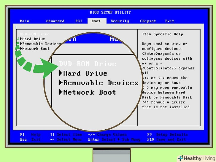 Перемістіть оптичний привід в початок списку завантажувальних пристроїв. коли ви виберете опцію «CD Drive», натискайте клавішу + до тих пір, поки ця опція не опиниться у верхній частині списку завантажувальних пристроїв.- Якщо це не вдалося, подивіться на список клавіш і їх функціональність в правому нижньому кутку екрану (або в нижній частині екрана), щоб з'ясувати, яку клавішу потрібно натиснути, щоб перемістити обрану опцію.
