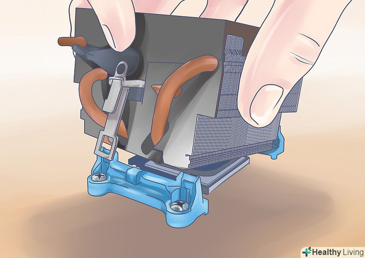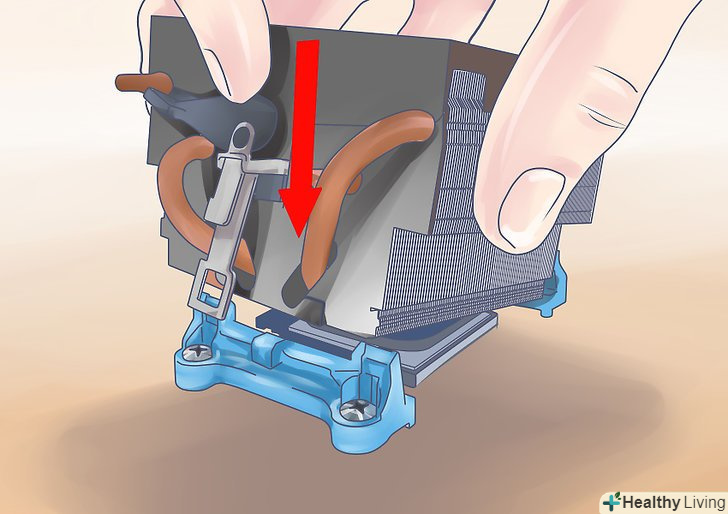 Встановіть радіатор.якщо ви нанесли термопасту будь-яким з методів "ліній", рівномірно натисніть на радіатор з усіх боків, і таким чином паста рівномірно розподілитися (розмажеться) по контактній поверхні. Якщо ви використовували метод "розподілу", встановлюйте кулер під невеликим кутом, щоб запобігти появі бульбашок. Це тому, що паста зазвичай розподіляється занадто тонким шаром, що не дозволяє уникнути появи бульбашок при натисканні.