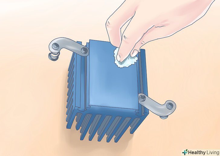 Очистіть процесор і поверхню радіатора.протріть поверхню ватним тампоном, змоченим спиртовим розчином. Чим вище відсоток вмісту алкоголю, тим краще. 70% - добре, але найкраще 90%.[1]