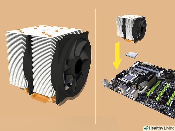 Виберіть процесорний кулер.[7] як правило, це теплорозсіювальний радіатор з прикріпленим вентилятором, або просто радіатор. Шукайте кулер сумісний з 120 мм вентиляторами. Як і у випадку з корпусами, комплектний вентилятор може бути тихим, але особливо розраховувати на це не варто. Радіатори "баштового типу" є самими тихими. Переконайтеся, що кулер увійде в корпус, будучи встановленим на материнці. Краще уникати суцільномедних радіаторів, оскільки охолоджують вони лише трохи краще, ніж мідно-алюмінієві конструкції, але вони такі важкі, що є ризик пошкодити материнську плату при пересуванні системного блоку.- Процесорний кулер повинен мати кріплення, сумісне з материнською платою. Як правило, вони володіють набором різних кріплень, але слід уточнити цей момент.