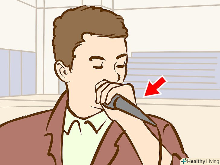 Тримайте мікрофон належним чином.техніка мікрофона дуже важлива для виконання або якщо ви просто хочете поліпшити звук, видаваний ротом. Є різні способи тримати мікрофон. Ви можете просто тримати його, як під час співу, але деякі бітбоксер воліють покласти мікрофон між безіменним і середнім пальцями, а потім захопити мікрофон першими двома пальцями зверху біля основи і пальцем в нижній частині мікрофона для більш чіткого звуку.- Намагайтеся не дихати в мікрофон під час бітбоксингу.