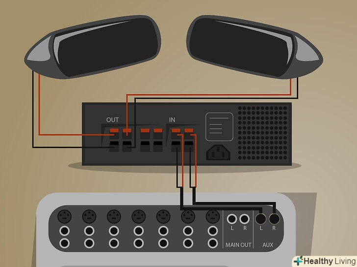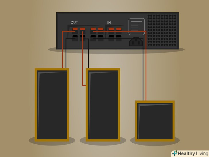 Підключіть динаміки.підключіть кабелі від роз'ємів 'Output' на підсилювачі потужності до роз'ємів 'Input' на динаміках. Примітка: Якщо у вас є активні акустичні системи (колонки, які мають підсилювач потужності, вбудовані в них), ви можете звертати всі посилання на підсилювачі як посилання на динаміки себе, так як підсилювач і динамік вже підключені