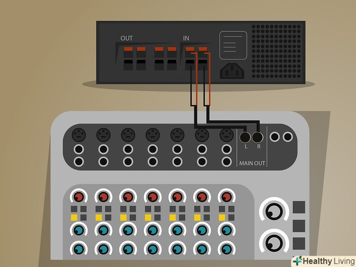 Підключіть ваші підсилювачі потужності.підключіть кабелі від роз'єму 'Main Out' на мікшері до гнізд 'Input' на підсилювачі потужності (або активних акустичних системах).