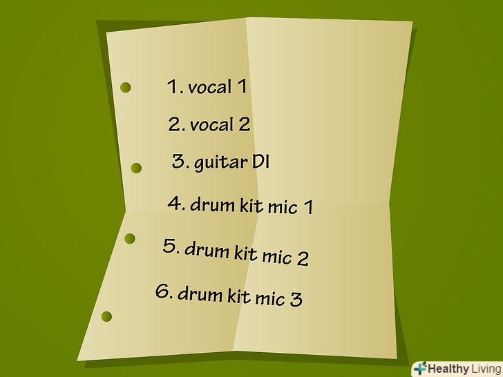 Створіть список входів 'Input List'.запишіть пронумерований список кожного мікрофона або DI-box, зліва направо, перебуваючи на платі. Наприклад: 1. Гітара DI 2. клавіатура DI 3. Звуковий Мікрофон Кіма.