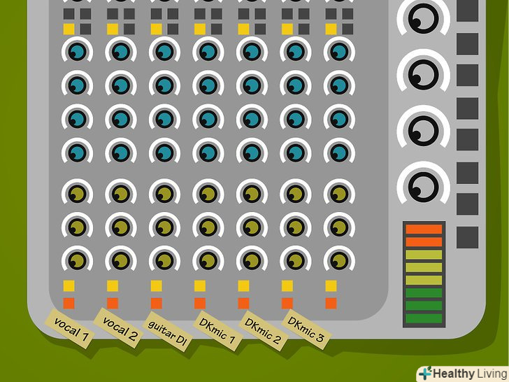 Позначте звукову карту. візьміть смужку стрічки і помістіть її на звукову плату трохи нижче фейдерів, використовуйте маркер, щоб скопіювати список вхідного сигналу на стрічку так, щоб кожен фейдер мав один пункт під ним (можливо, доведеться використовувати скорочення, щоб відповідати цим ярликам в просторі під кожним фейдером, пишіть "ЗвукМ" замість "звуковий мікрофон", наприклад).