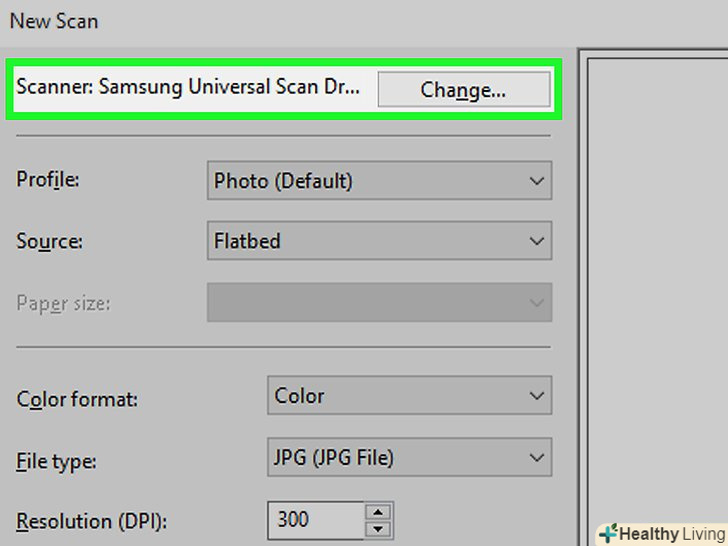 Виберіть сканер. якщо у верхній частині вікна немає імені вашого сканера або якщо вибрано інший сканер, натисніть «Змінити» (у верхній правій частині вікна), а потім виберіть потрібний сканер.