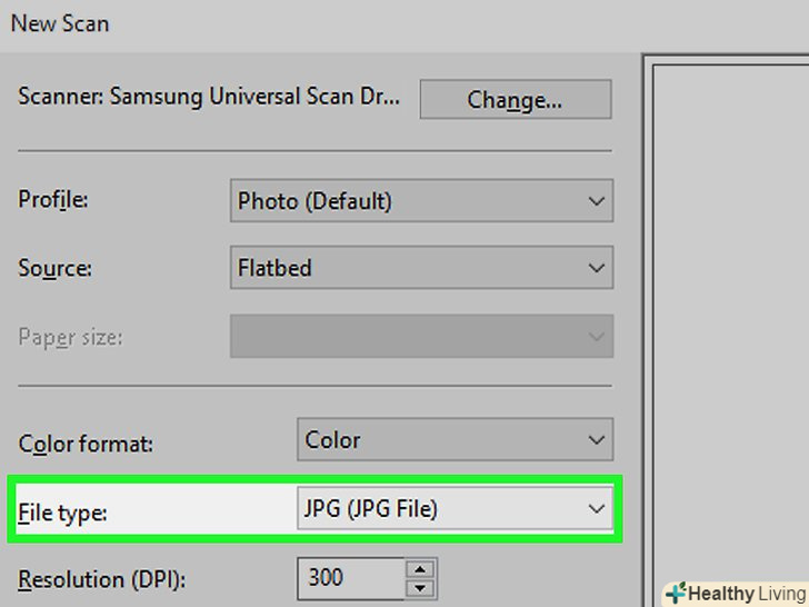 Виберіть тип файлу.у випадаючому меню "Формат" виберіть формат файлу (наприклад, " PDF "або» JPЕG"), в якому буде збережений кінцевий файл.- Рекомендуємо вибрати формат "PDF", якщо ви скануєте документ, а не зображення.
