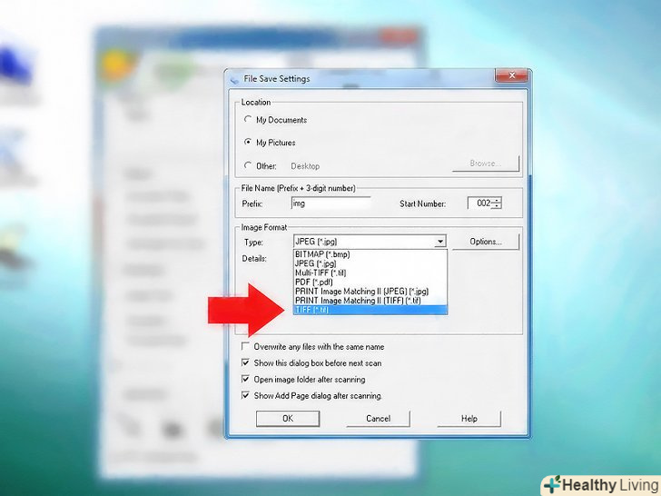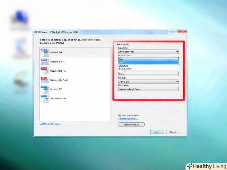 Встановіть опції сканування.можна встановити такий режим сканування: кольоровий, чорно-білий, відтінки сірого або користувальницький. Можете вибрати цифровий формат, в якому хочете зберегти зображення (jpg, jpeg або tiff).