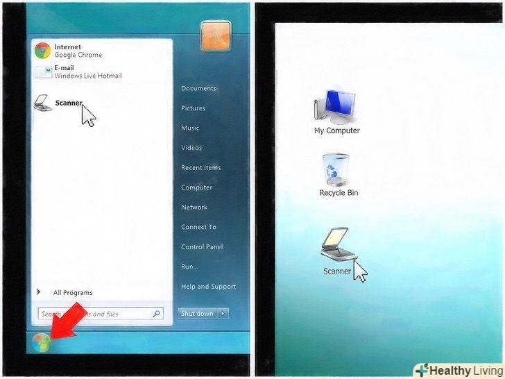 Знайдіть розташування програми для сканування.у Windows натисніть кнопку "Пуск", щоб викликати список встановлених програм. Якщо використовуєте Mac, натисніть іконку сканера. Якщо програма для сканування не встановлена або вам не вдається знайти інсталяційний диск, можете скористатися простими вбудованими утилітами або завантажити перевірену програму з надійного сайту, Наприклад, CNET.- У Windows вбудована утиліта називається "факси та сканування Windows", і її можна знайти за допомогою рядка пошуку в меню "Пуск".