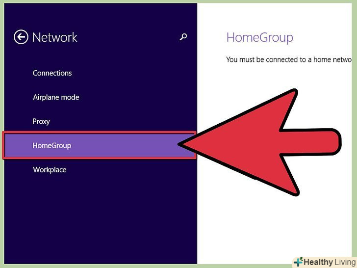 Відкрийте меню домашньої групи.домашня група-це комп'ютери в домашній мережі, які можуть спільно використовувати файли і принтери. До домашньої групи можуть підключатися комп'ютери під управлінням Windows 7 і 8.- Відкрийте меню Charms. Для цього проведіть по правій частині екрана або перемістіть курсор в правий нижній кут екрану.