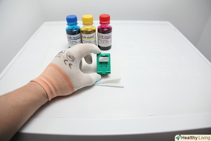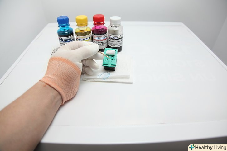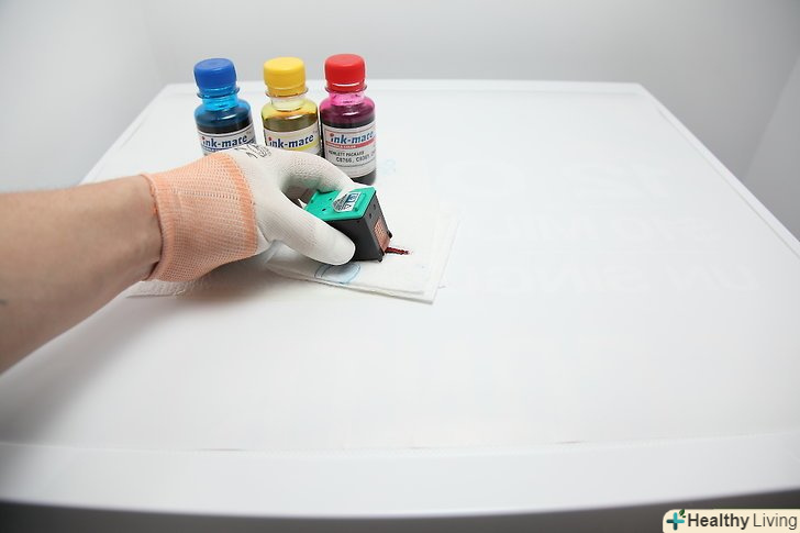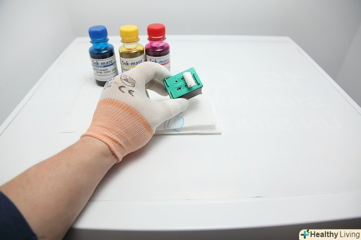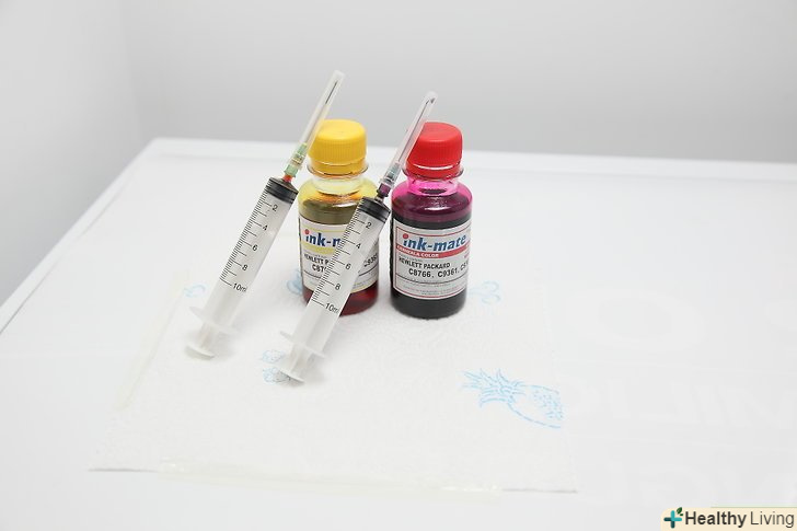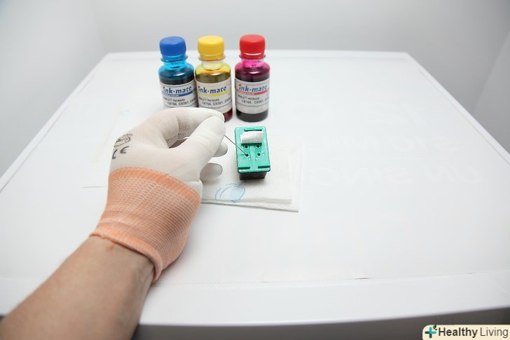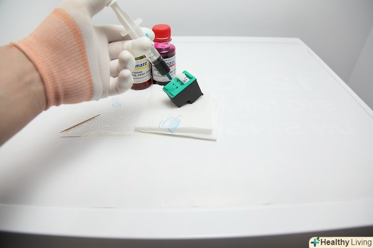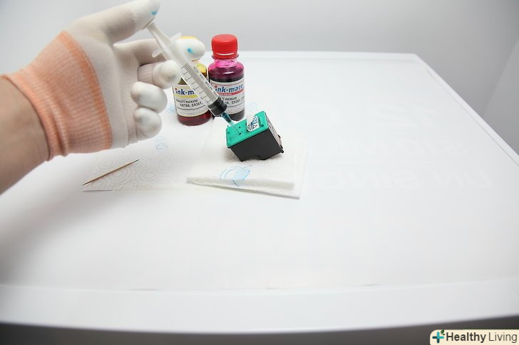 - Якщо ж кольору все ще не проявляються після друку, введіть шприцом одну або дві невеликі краплі нашатирного спирту (одна частина аміаку і одна дистильованої води) настільки глибоко в картридж, наскільки вийде. Тобто поруч з друкуючої головкою (але не дуже близько, так як над друкуючої головкою зазвичай знаходиться покриття, яке легко пошкодити). Це допоможе розчинити залишилися згустки чорнила в майже мікроскопічного розміру соплах.