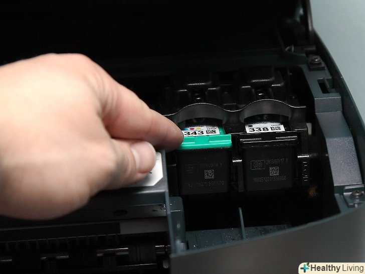 - Якщо один з кольорів погано друкується після заміни картриджа, вийміть картридж з принтера і огляньте стрічку, що закриває отвори для заправки. Зніміть її і поверніть на місце, так ви усунете вакуум, який міг перешкоджати нормальному надходженню чорнила.