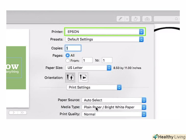Виберіть принтер Epson.відкрийте меню «Принтер» (у верхній частині вікна «Друк») і виберіть в ньому принтер Epson.