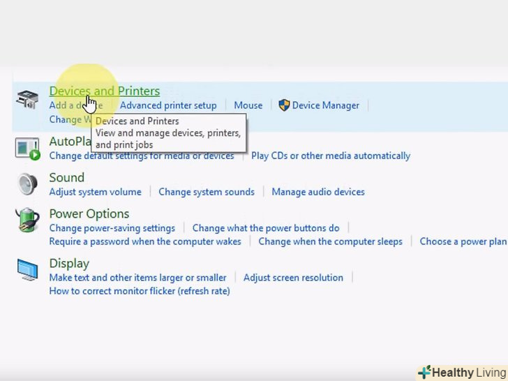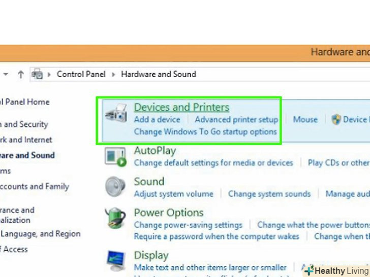 НатиснітьПристрої та принтери.ця опція знаходиться на правій стороні вікна панелі управління.- Якщо інформація у вікні панелі керування відображається за категоріями, натисніть "Перегляд пристроїв та принтерів «у розділі»Обладнання та звук".