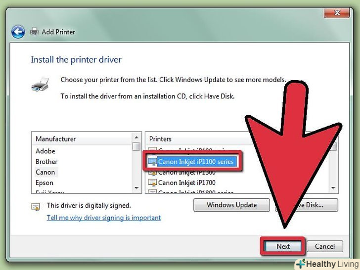 Після закінчення пошуку всі принтери, підключені до мережі, будуть перераховані. натисніть на ім'я принтера, яке записали раніше, і натисніть NEXT.
