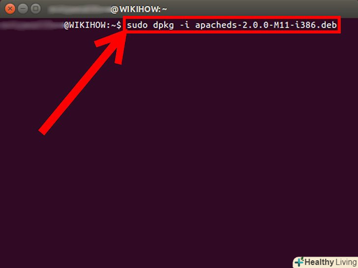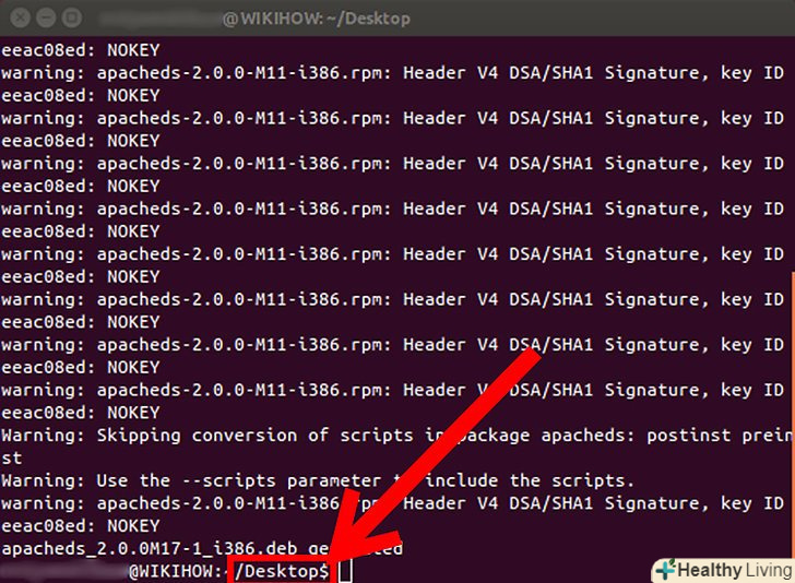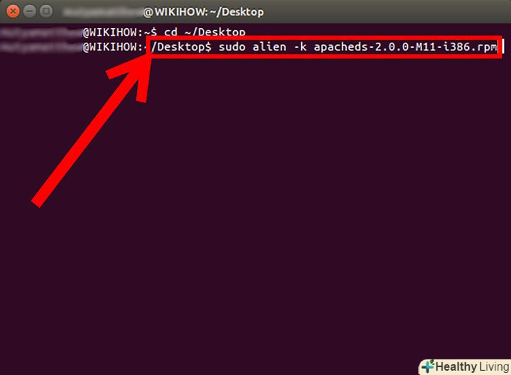 Введіть таку команду в терміналі: sudo alien-k apacheds-2.0.0-M11-i386.rpm (натисніть Enter).- Синтаксис команди такий: sudo alien-k файл.rpm (цією командою виконується перетворення в формат .deb), замініть слово 'файл' на ім'я перетворюваного пакета. В даному випадку: apacheds-2.0.0-M11-i386.rpm.