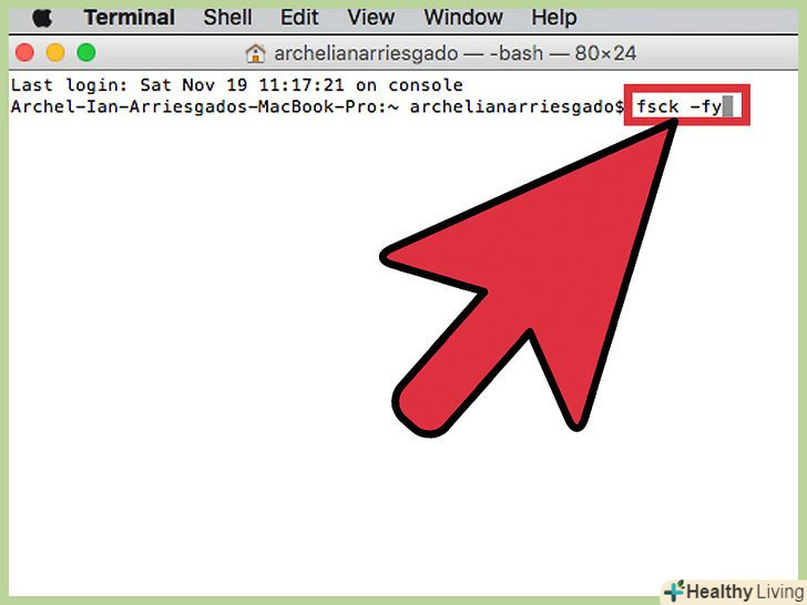 Введіть.fsck -fy І натисніть клавішу ⏎ Return.це запустить сканування вашого жорсткого диска на предмет помилок і займе кілька хвилин. Цей крок є обов'язковим.