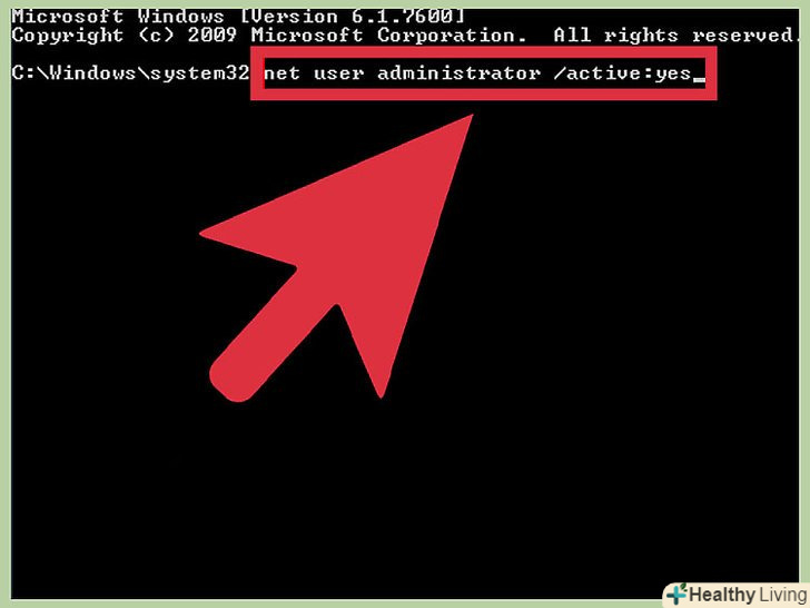 Введіть.net user administrator /active:yes І натисніть клавішу ↵ Enter.таким чином, ви включите на комп'ютері обліковий запис адміністратора. Зазвичай обліковий запис адміністратора включають для виконання автоматизованих завдань без необхідності кожен раз бачити UAC-повідомлення (User Account Control – Контроль облікових записів користувачів), що викликається зміною системних налаштувань.[1]