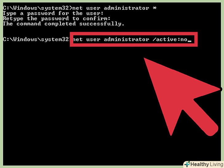 Введіть.net user administrator /active:no І натисніть клавішу ↵ Enter.цим ви вимкніть обліковий запис адміністратора. Не рекомендується залишати обліковий запис адміністратора включеної, якщо ви нею не користуєтеся. Як тільки ви встановите пароль і виконайте все, що хотіли, вимкніть обліковий запис в командному рядку.