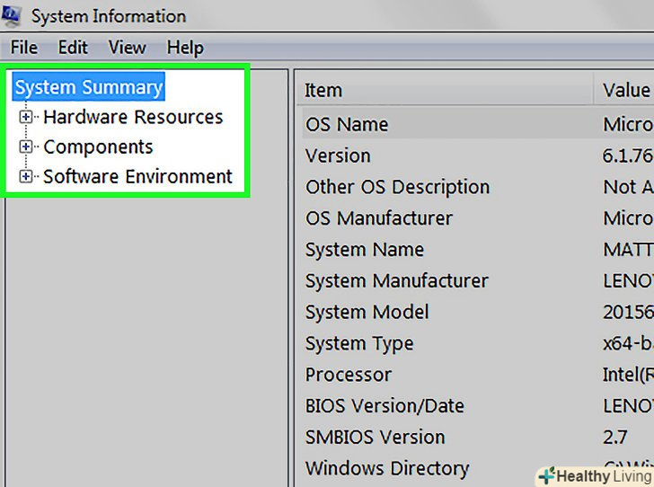Натисніть↵ Enter. Відкриється вікно «Відомості про систему». У верхньому лівому куті вікна є чотири вкладки:- Відомості про систему. Ця вкладка відкривається за замовчуванням і містить відомості про операційну систему комп'ютера, встановленої пам'яті і типі процесора.