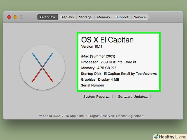 Перегляньте інформацію про комп'ютер. у верхній частині вікна «про це Mac " є кілька вкладок, які можна використовувати для перегляду різної інформації:- Загальні відомості. На цій вкладці можна знайти інформацію про операційну систему, процесор і пам'ять.