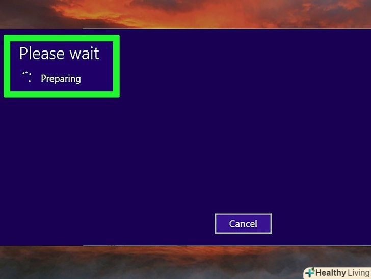 Дотримуйтесь інструкцій на екрані і виконайте скидання комп'ютера.після завершення перевстановлення відобразиться Початковий екран.[2]- Якщо ви оновили операційну систему до версії 8.1, скидання комп'ютера відновить Windows 8. Після цього вам доведеться знову оновити операційну систему до версії 8.1.