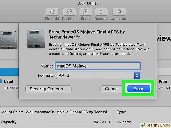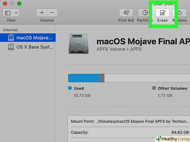 Виберіть на лівій панелі утиліти завантажувальний або жорсткий диск, який хочете скинути, а потім натисніть на вкладку «стерти».
