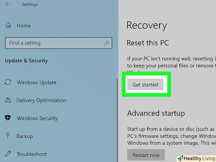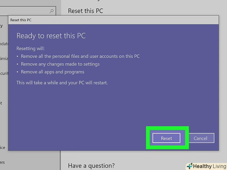 - Дотримуйтесь інструкцій на екрані, щоб виконати скидання комп'ютера.в результаті ви опинитеся на початковому екрані, а комп'ютер буде відновлений до заводських налаштувань.[5]