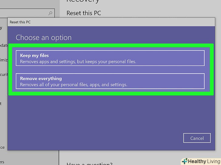 Виберіть одну з представлених опцій. На Windows 10 можна виконати скидання і зберегти свої файли, видалити всі файли або відновити пристрій до заводських налаштувань.- Зберегти мої файли: перевстановлення Windows 10 зі збереженням всіх особистих файлів. Програми, драйвери, а також встановлені або змінені налаштування будуть видалені.