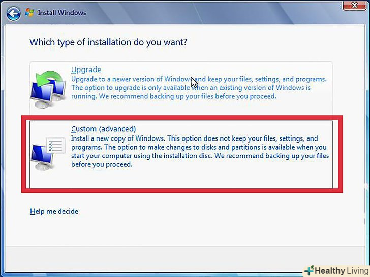 Виберіть тип установки. Windows запропонує вам вибрати між оновленням системи або вибірковою установкою. Навіть якщо Ви оновлюєте стару версію Windows, настійно рекомендується вибирати вибіркову установку і встановлювати систему з нуля. Це дозволить уникнути проблем, пов'язаних з несумісністю старих і нових налаштувань.- Якщо ви встановлюєте Linux, вам буде запропоновано встановити Linux поруч з поточною Windows або очистити диск і встановити тільки Linux. Виберіть те, що найбільше вам підходить. Якщо ви виберете установку поруч з Windows, вам потрібно буде вибрати кількість місця на жорсткому диску, відведеного для Linux.