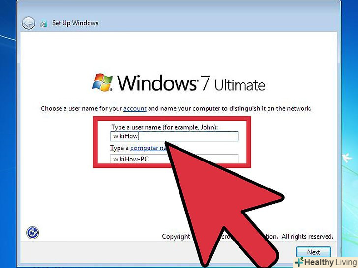 Створіть обліковий запис Windows.після закінчення установки Windows вам потрібно вибрати ім'я користувача. Ви також можете створити пароль, хоча це необов'язково. Після створення облікового запису вам буде запропоновано ввести код активації.- У Windows 8 Вам спочатку буде запропоновано вибрати колірну схему. Після цього ви зможете зайти в свій аккаунт Microsoft або скористатися традиційною обліковим записом Windows.