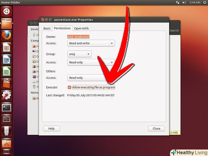 Натисніть "Permissions«, а потім поставте галку у»Allow executing file as program". натисніть «Close».