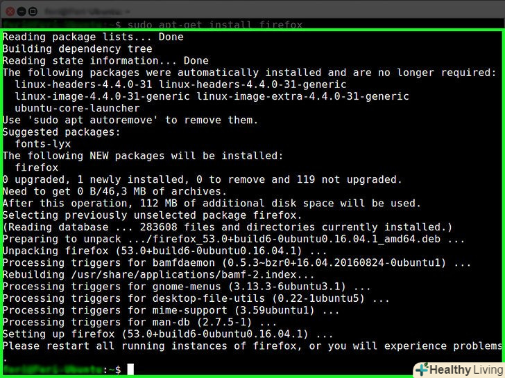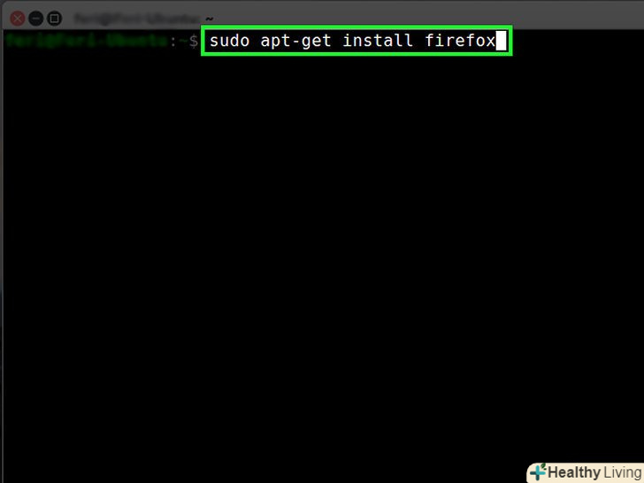 Введіть таку команду: "sudo apt-get install firefox "(без лапок), щоб встановити, наприклад, Firefox. Ви можете замінити слово «firefox» в команді, на ім'я будь-якої іншої програми, яку хочете встановити.