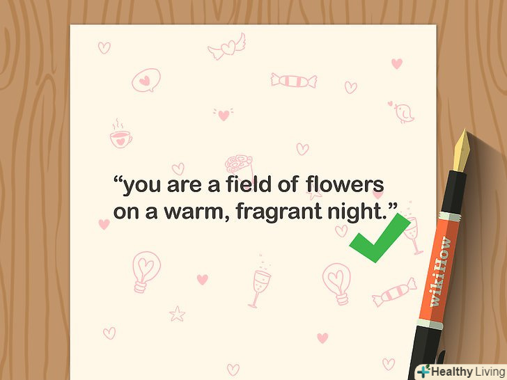 Прикрасьте написане порівняннями.як і метафора, порівняння-це спосіб описати вашу любов, використовуючи щось символічне. Тим не менш, порівняння передбачає, що просто одна річ схожа на іншу.- Знову використовуючи запах вашої коханої як приклад, ви могли б сказати, що вона немов поле квітів. Однак, не уточнивши, чому вона схожа на поле квітів, Ви можете виявитися недозрозумілим: вона немов поле квітів, тому що яскрава, добре пахне, або приваблює чоловіків, як бджіл приваблює нектар? Всі ці варіанти можливі, так що переконайтеся, що опис завершено!