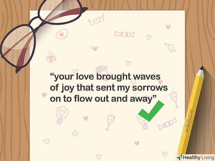 - Попрацюйте з усім написаним вами, додаючи стільки метафор, скільки можете. Деякі з них можуть виявитися вишуканими шедеврами, деякі можуть бути гірше нікуди. На даному етапі метою є просто з'ясувати, що ви можете сказати про свою любов.