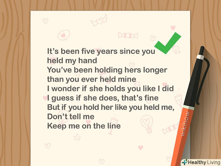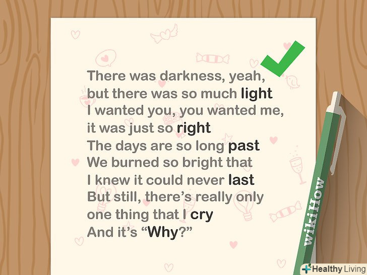 Напишіть про свою любов.перш ніж перетворити почуття на вірші та музику, ви хочете виразити себе без обмежень рими та ритму. Щоб зробити це, опишіть людину, яку любите, що відчуваєте до нього, і яке вам разом.- Ви можете описати фізичні риси, в тому числі і як він / вона виглядає, як рухається, як любить, як танцює – все, що описує його/її з фізичної сторони.