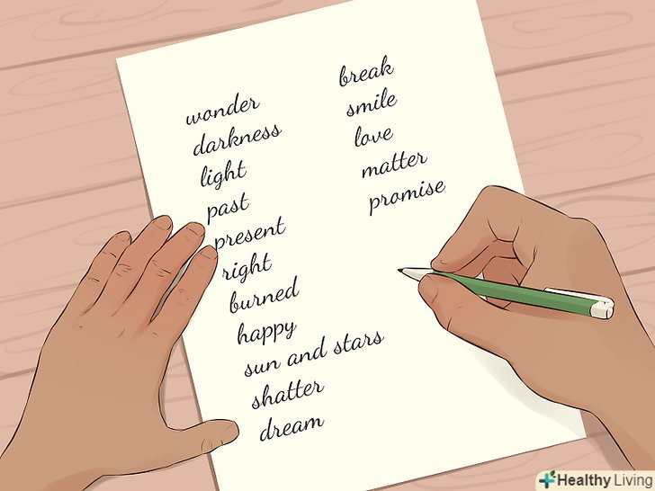 Знайдіть Риму. для списку слів створеного образу використовуйте словник рим і знайдіть найкраще слово або слова, які римуються, для кожного слова зі списку. Деякі буде знайти легко, деякі - не дуже!- Наприклад, таке слово, як " квітка "легко піддається Римі:" Схід"," паросток"," пелюстка", в той час, як деякі є більш складним завданням, наприклад,"метелики". Ви можете використовувати список Рим для кожного слова, щоб звузити список відповідних слів, виключаючи ті, які або невдалі, або зовсім не підходять.