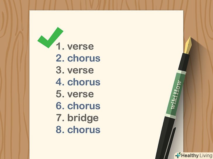 Визначте основну лінію вашої пісні.тепер, коли у вас вже є поняття, як ви збираєтеся оформляти оду вашої любові, визначте, що хочете сказати і як Ви Це хочете сказати. Стандартний формат пісень про кохання це: куплет, куплет, приспів, куплет, приспів.- Кожен куплет говорить щось нове про предмет вашої любові, а Приспів пов'язує це все разом. Зробіть начерк того, що б ви хотіли написати в кожній частині.