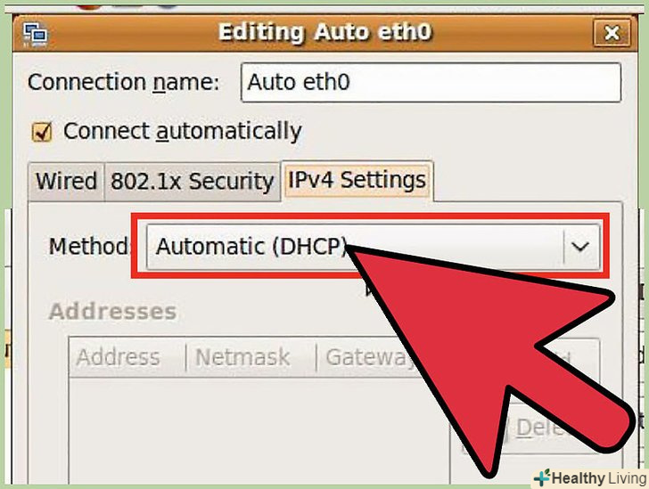 Натисніть на вкладку "IPV4 Settings". виберіть опцію "Automatic (DHCP)", якщо ваша мережа має DHCP сервер. Сервер DHCP автоматично присвоює IP-адресу вашій системі. Натисніть кнопку " Apply."- Ви також можете вибрати варіант "Manual "" зі спадного списку Method і призначити IP-адресу, маску мережі і шлюз вручну. Ви також повинні будете призначити адресу DNS-сервера. Натисніть кнопку " Apply."