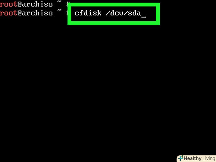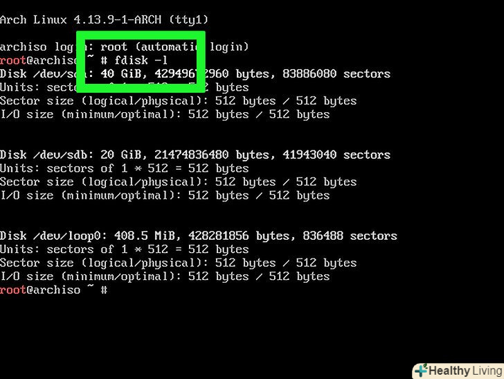 Перевірте підключені диски.в даний момент до комп'ютера підключені як мінімум два диски: жорсткий диск і DVD-диск з установником Arch Linux. Щоб перевірити підключені диски:- Введітьfdisk -l натисніть ↵ Enter;