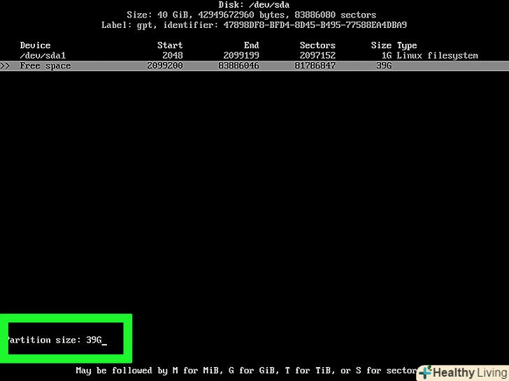 - Введіть число мегабайт (наприклад, 1024 для одного гігабайта) і натисніть↵ Enter; як правило, розмір swap-розділу повинен бути в 2-3 рази більше розміру оперативної пам'яті (наприклад, якщо Оперативна ПАМ'ЯТЬ КОМП'ЮТЕРА дорівнює 4 ГБ, swap-розділ повинен бути рівний 8192 МБ або 12288 МБ);