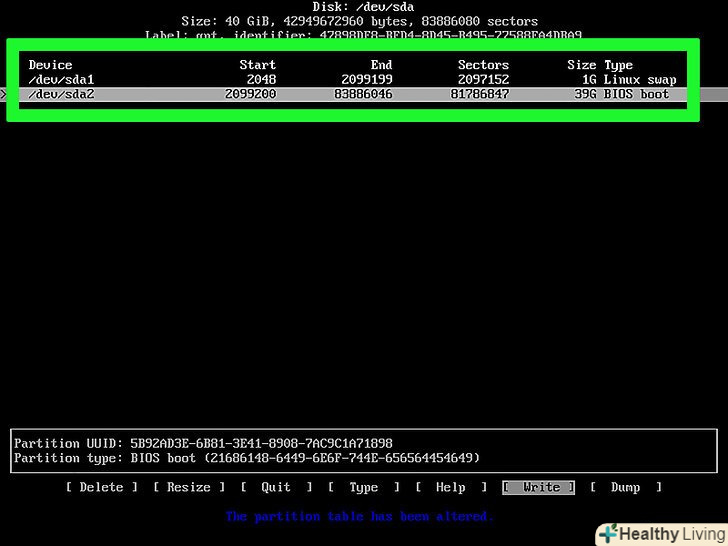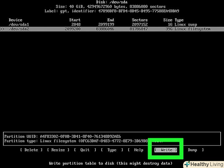 - Якщо swap-розділ все ще виділений, виберіть «Write» (запис) і натисніть↵ Enter;
