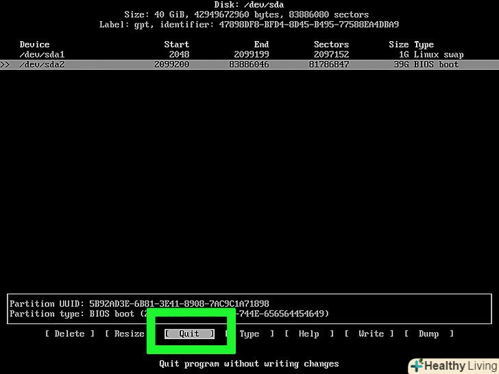 Закрийте утиліту cfdisk. виберіть «Quit» (вихід) і натисніть ↵ Enter.