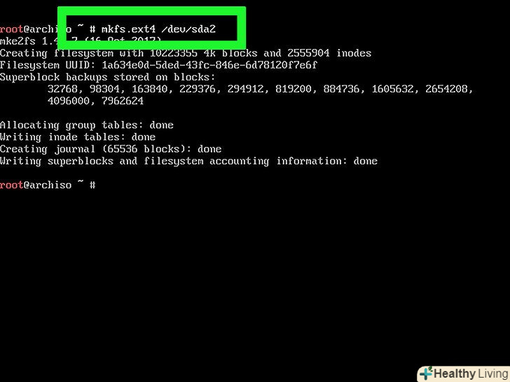 Відформатуйте первинний розділ.так ви зможете використовувати його в операційній системі. Для цього введіть mkfs.ext4 /dev/[ім'я первинного розділу] і натисніть ↵ Enter.- Наприклад, якщо ім'я первинного розділу «sda2», введітьmkfs.ext4 /dev/sda2.
