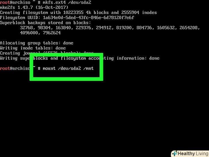 Примонтуйте відформатований розділ. Введіть mount /dev/[ім'я розділу]/mnt натисніть ↵ Enter. Розділ стане диском, з яким можна працювати.