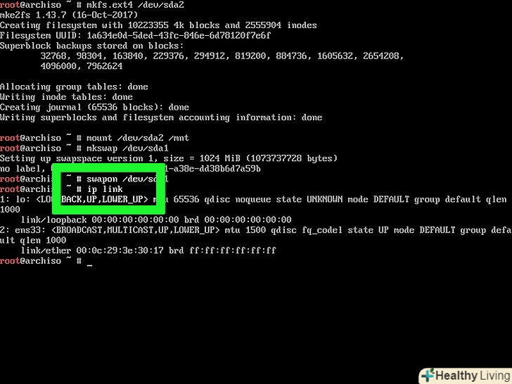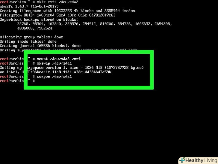 Додайте файл підкачки на swap-розділ. Введіть mkswap /dev/[ім'я розділу] натисніть ↵ Enter, а потім введіть swapon /dev/[ім'я розділу] і натисніть ↵ Enter. Тепер можна встановити Arch Linux.- Наприклад, якщо ім'я swap-розділу «sda1», введітьmkswap /dev/sda1, а потім введіть swapon /dev/sda1.