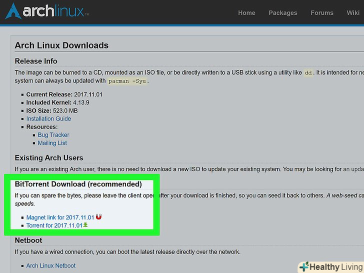 - Відкрийте сторінкуhttps://www.archlinux.org/download/ в браузері;