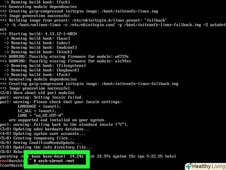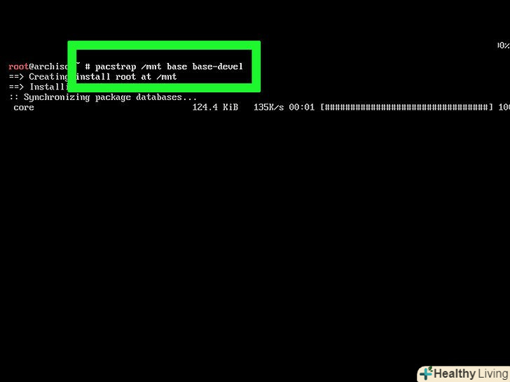 Встановіть базову систему. Введіть pacstrap/mnt base base-devel натисніть ↵ Enter. Почнеться установка системи на комп'ютер.- Як правило, цей процес займає близько 15-30 хвилин в залежності від швидкості інтернет-з'єднання.
