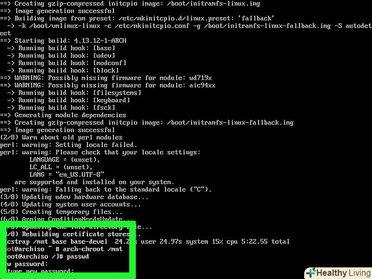 Відкрийте доступ до кореневого каталогу. Введіть arch-chroot/mnt натисніть ↵ Enter. Тепер можна змінити параметри кореневого каталогу, включаючи пароль.